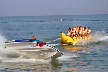 This is very joyful activity adorable by children and adults, especially being a part of a big group. Riding in a banana boat is considered to be a safer activity than water-skiing or other towed-water sports.