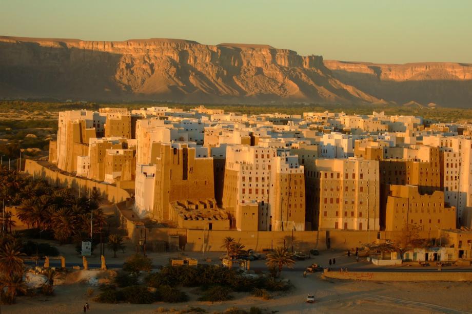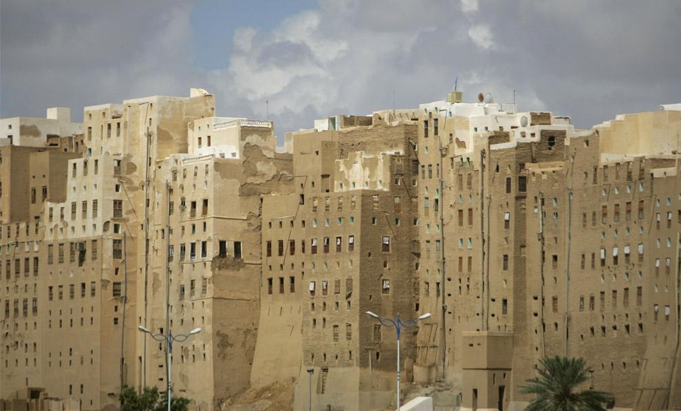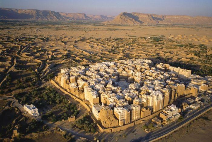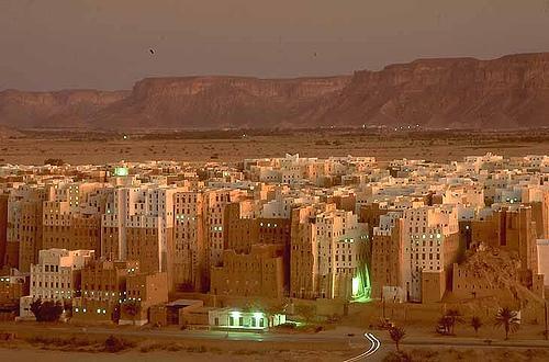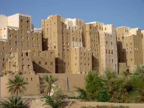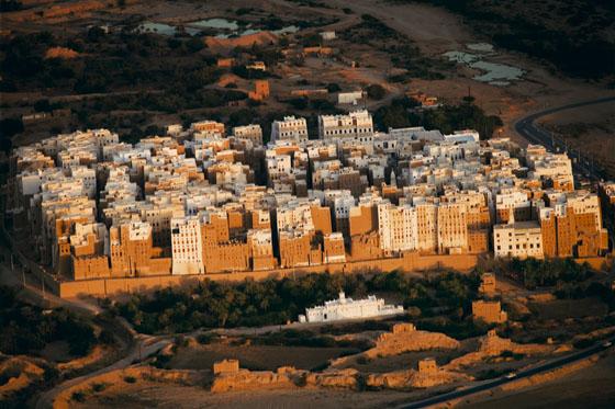 A hundred miles inland from the South Arabian port of Mukalla, in a fertile wadi near the westernland of the Empty Quarter, stands the improbable city of Shibam. Its buildings are skyscrapers of sun-baked clay, towering up to twelve storeys high-in former time an impregnable defence against the marauding Bedouin of the desert.