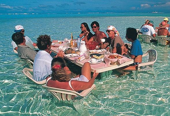 Only in Tahiti… You will begin to thinking this at the very moment of arrival. As your boat will pull into dock, a group of French-shouting Chinese water-skiers sported in the lagoon around you. Along the quai sped a motor scooter carrying a man, a woman, a baby and a live pig. And on the kerb nearby sat a classically ragged and whiskered tramp holding a golden-capped bottle of champagne.