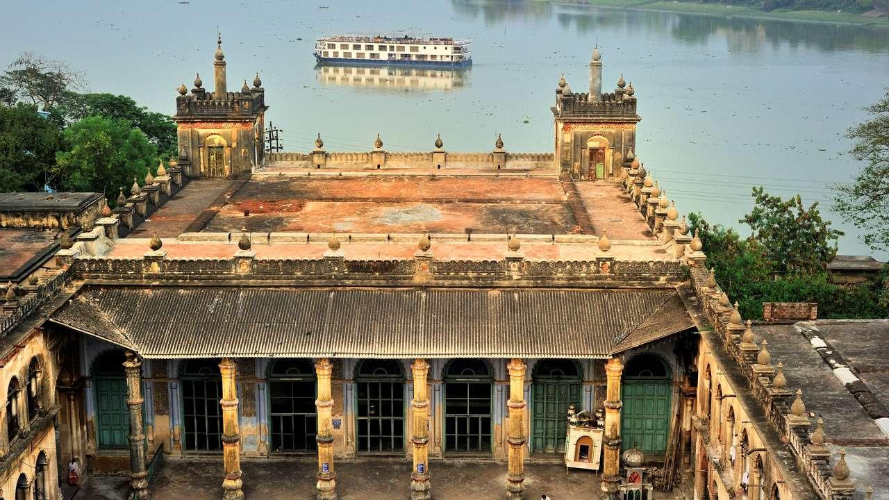 As you begin your downstream trail, have an encounter with the nobility in Murshidabad, with the sterile grandeur of Hazarduari Palace (c. 1836) that is offset by the soil-topped grave of the city’s founder, Murshid Quli Khan, at Katra mosque (c. 1723). The Hazarduari (Thousand Doors) Palace also doubles up as the museum, which was designed by the British Sappers Regiment, and was constructed in Italian marble between 1829 and 1837. It has perhaps 900 ‘real’ doors, including French windows, as well as a plethora of false doors, making it to Thousand Doors. Have the spectacle of Nawab Nazeem Humayun Jha, who is reputed to have spent an unbelievable sum of money for that time, INR 18 lakhs on his residence. Spread over three floors, the palace has some 120 rooms. The walls are lined with old oil portraits. Artefacts include the silver throne of the nawabs, chandeliers and antique furniture. While docked at the palace for the night, your tour guide may spring a surprise: “coming aboard is the Chhota Nawab of Murshidabad”, descendant of Mir Jafar.
