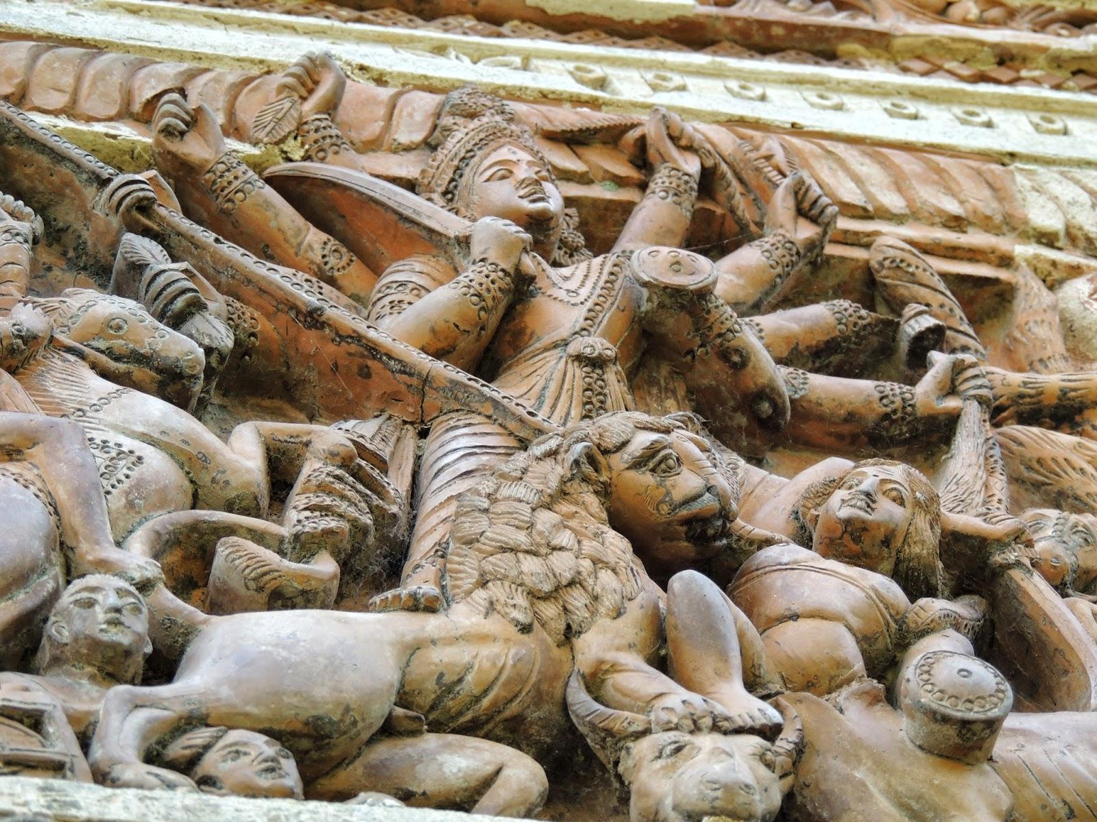 This trip will provide a fair sampling of the religious architecture of the region. The finest terracotta temples are unquestionably in Bardhaman’s Kalna. The oldest, Lalji (c. 1739), has 25 turrets and is adorned with unique vertical fins festooned with stacks of mythical horsemen being attacked by tigers in full flow. The newest, Pratapeshwar (c. 1849), built in a curvilinear shikhara style, has a breathtaking arch-panel in which Ravana worships Durga in a blazing display of heads and arms.