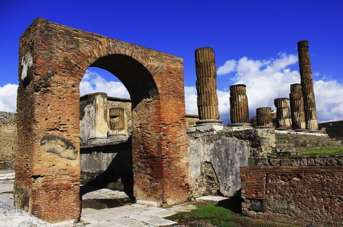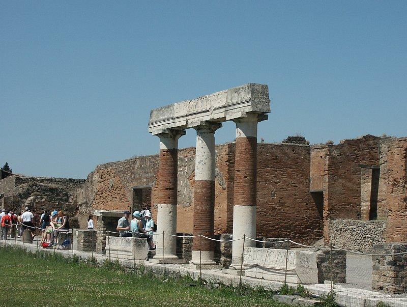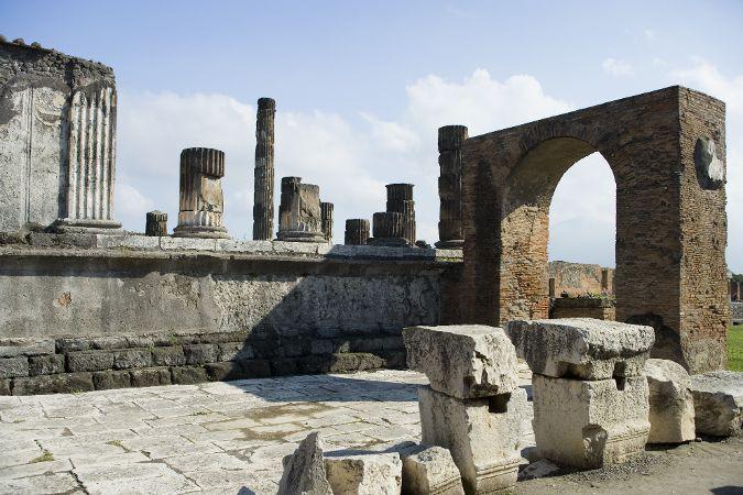 At the forum's northern end is the Tempio di Giove (Temple of Jupiter), which has one of two flanking triumphal arches remaining, and the Granai del Foro (Forum Granary), now used to store hundreds of amphorae and a number of body casts that were made in the late 19th century by pouring plaster into the hollows left by disintegrated bodies. The macellum nearby was once the city's main meat and fish market.